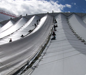 Medium strength of PVC film, the thickness is only 0.8 mm, but its tensile strength is equal to half of the steel. Medium strength of PTFE membrane, its thickness is only 1.0 mm, but its tensile strength has reached the level of steel. Membrane material of elastic modulus is low, it is advantageous to the membrane material to form complex surface modeling.