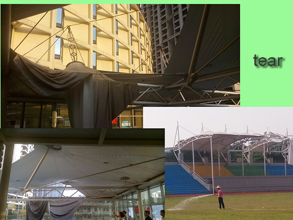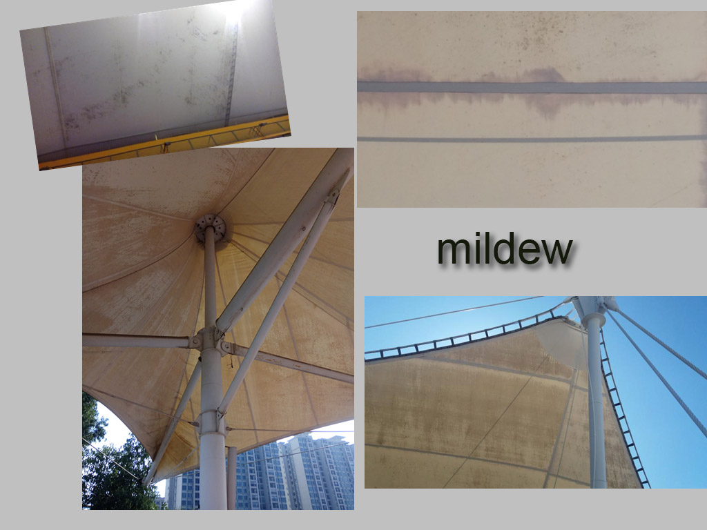 Some inferior membrane material, often through with little or no coating self-cleaning coating, or other materials, such as varnish coating, such as to reduce the production cost, in order to achieve the purpose of low price competition. And the customer is hard to through the naked eye to distinguish whether membrane material surface coating by fraud. In general, about 1 year after the completion, use inferior membrane material engineering will appear membrane body loose, creep, membrane material in the mould, black spots, moreover there will be a table coating peel off. Three years later, mildew spot piece, membrane-based cloth wire in the mould is broken, intensity is abate, in the wind blows, the formation of holes, cracks, eventually scrapped broken.