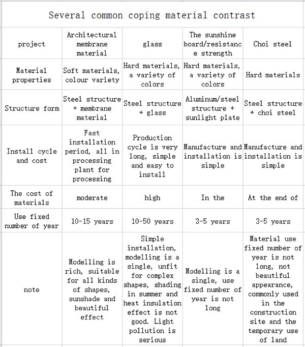 Common roof cover material, through comparing the table below. It is clear that membrane structure of good cost performance.