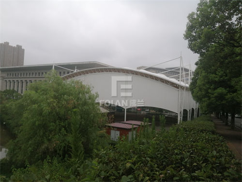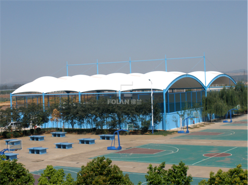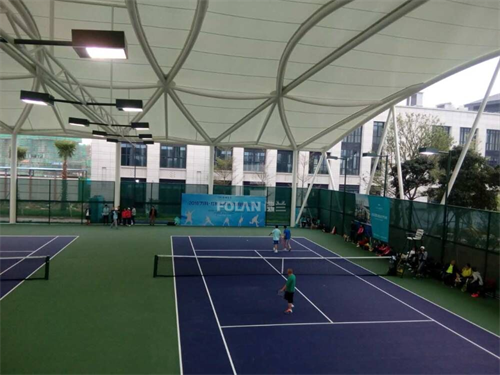 网球场膜布局,因此修建织物,即膜资料为张拉主体,与支持构件或拉索配合构成的布局系统,它以其新奇怪异的修建外型,杰出的受力特色,成为大跨度空间布局的首要情势之一。