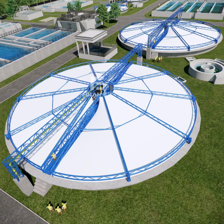 深圳市佛兰空间膜布局无穷公司连系该污水厂现实环境,经心设想了优良耐用的随动式污水池钢支持反吊膜布局。反吊膜布局加盖,便是操纵钢布局在外,将膜材反吊的布局情势,该工程接纳了抗侵蚀才能很强的氟碳纤膜把废气罩住,钢布局在里面将膜悬吊。如许既阐扬了氟碳纤膜的抗侵蚀机能,又从底子上处置了钢布局因为与侵蚀性气体打仗而带来的侵蚀题目。