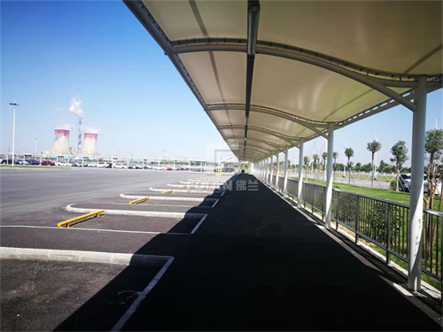 张拉膜布局车棚是依托膜自身的张拉应力与支持杆和拉索配合组成体系。在阳光的照耀下,膜布局车棚内布满天然漫射光,全部空间敞亮坦荡又协调。