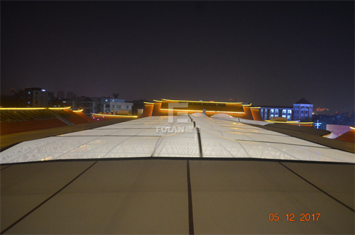 该工程位于广东阳江广场,名目分1-4期,膜布局笼盖总面积约为7600㎡,布局情势为骨架张拉式笼盖红色PVDF膜材。