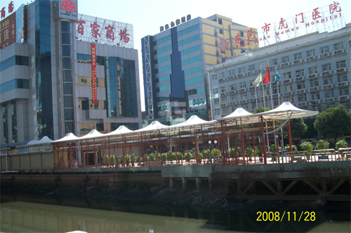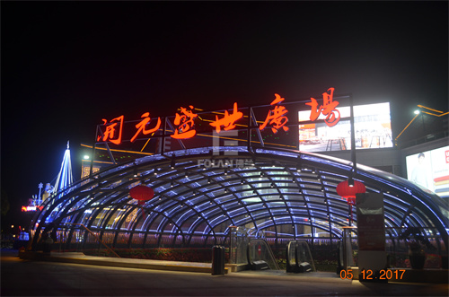 该工程位于浙江杭州贸易广场,呈竹节拱外型,布局情势为骨架张拉式笼盖红色PVDF膜材及通明ETFE膜材。