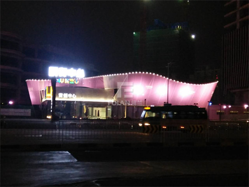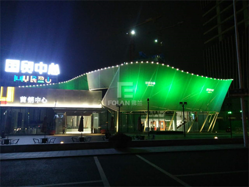 贸易中间外立面利用膜布局,不只外型怪异,曲线美好,夜晚跟着灯光的变幻,全部修建还五彩美丽。佛兰空间就曾在东莞制作过一个姑且国贸营销中间,其外立面接纳骨架势布局笼盖网格膜,夜晚景观非常壮美。