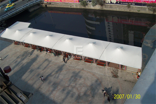 除外立面和盖顶,此刻良多贸易街都风行制作贸易景观,佛兰空间就曾为东莞虎门百家阛阓制作吊帽外形的长廊,这些膜布局凉亭不只可供主顾停脚安息,还能遮阳避雨。